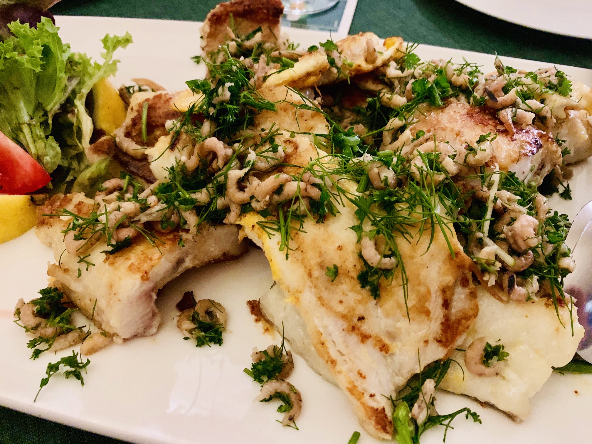 Weil wir drei Twitterer waren wählten wir die Kapitänsplatte mit Filets von Kabeljau, Scholle, Rotbarsch und Butterfisch, frisch in der Pfanne gebraten, mit frischen Kräutern und Nordseekrabben1, delikater Dijon-Senfcreme, dazu Bratkartoffeln.