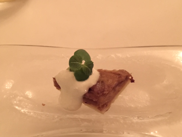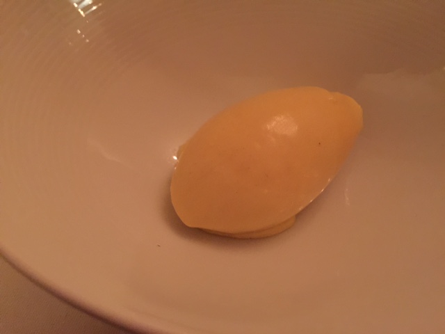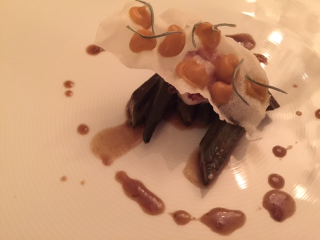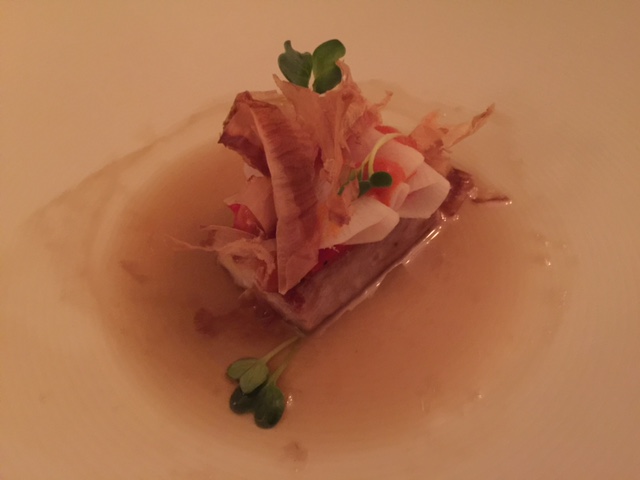 Skrei war zwar angekündigt in der Speisekarte. Aus dem hervorragenden Fisch wurde dann eine Goldmakrele – allerdings zum Preis von einem Skrei. Wirklich hervorragend und für mich der Gewinn des Abends war Dashi, Paprika und Rettich.