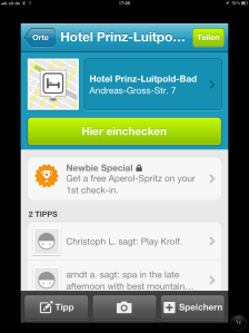 Soweit zur Tourismusgeschichte: Beim Einchecken in das Hotel Prinz-Luitpold-Bad checkte ich selbstverständlich auch bei Foursquare ein. Überrascht war ich, dass das Hotel dort bereits angelegt war. Ebenso überrascht war ich, dass in dem gesamten Hotel WLAN zur Verfügung stand. Den Zugangscode bekam ich sofort an der Rezeption. Mein erster Eindruck des Hotels war als digitaler Mensch sofort positiv. Ja, hier kann ich bleiben, hier fühl ich mich wohl – die Hotelierfamilie Gross hat mitgedacht.