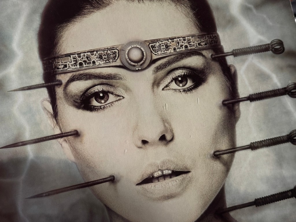 Das Cover zeigt ein nahes Porträt von Debbie Harrys Gesicht, das eine fast skulpturale, glatte Qualität hat. Ihr Gesicht ist durchstochen von vier langen Nadeln – zwei an den Schläfen und zwei an den Wangen. Diese Nadeln wirken wie chirurgische oder rituelle Instrumente, die durch ihre Haut gedrungen sind, aber es gibt keine sichtbaren Wunden oder Blutspuren, was dem Bild eine unheimlich sterile, aber auch hypnotische Atmosphäre verleiht. Der Hintergrund und die gesamte Komposition erinnern an Gigers typische biomechanische Ästhetik: fließende, metallisch-organische Strukturen, die eine Mischung aus Fleisch und Maschine andeuten. Die monochrome Farbgebung in silbrigen, grauen und blauen Tönen verstärkt den futuristisch-düsteren Look. Das Bild ist ein perfektes Beispiel für die Verschmelzung von Musik und Kunst, die beide Künstler anstrebten.