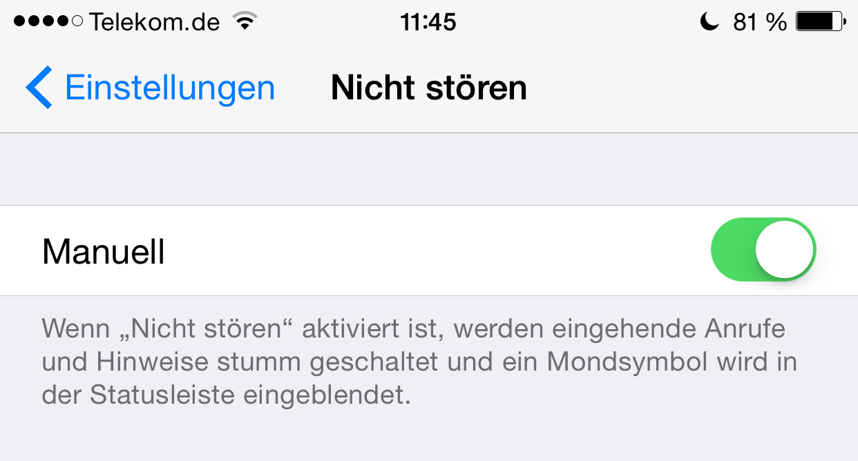 Seit dem Betriebssystem iOS 6 gibt es die „Nicht stören“-Funktion, die alle eingehenden Anrufe sofort auf den Anrufbeantworter umleitet. Der Weg dahin ist Einstellungen und Nicht stören. Dann wird das Mondsymbol in der Statusleiste eingeblendet.
