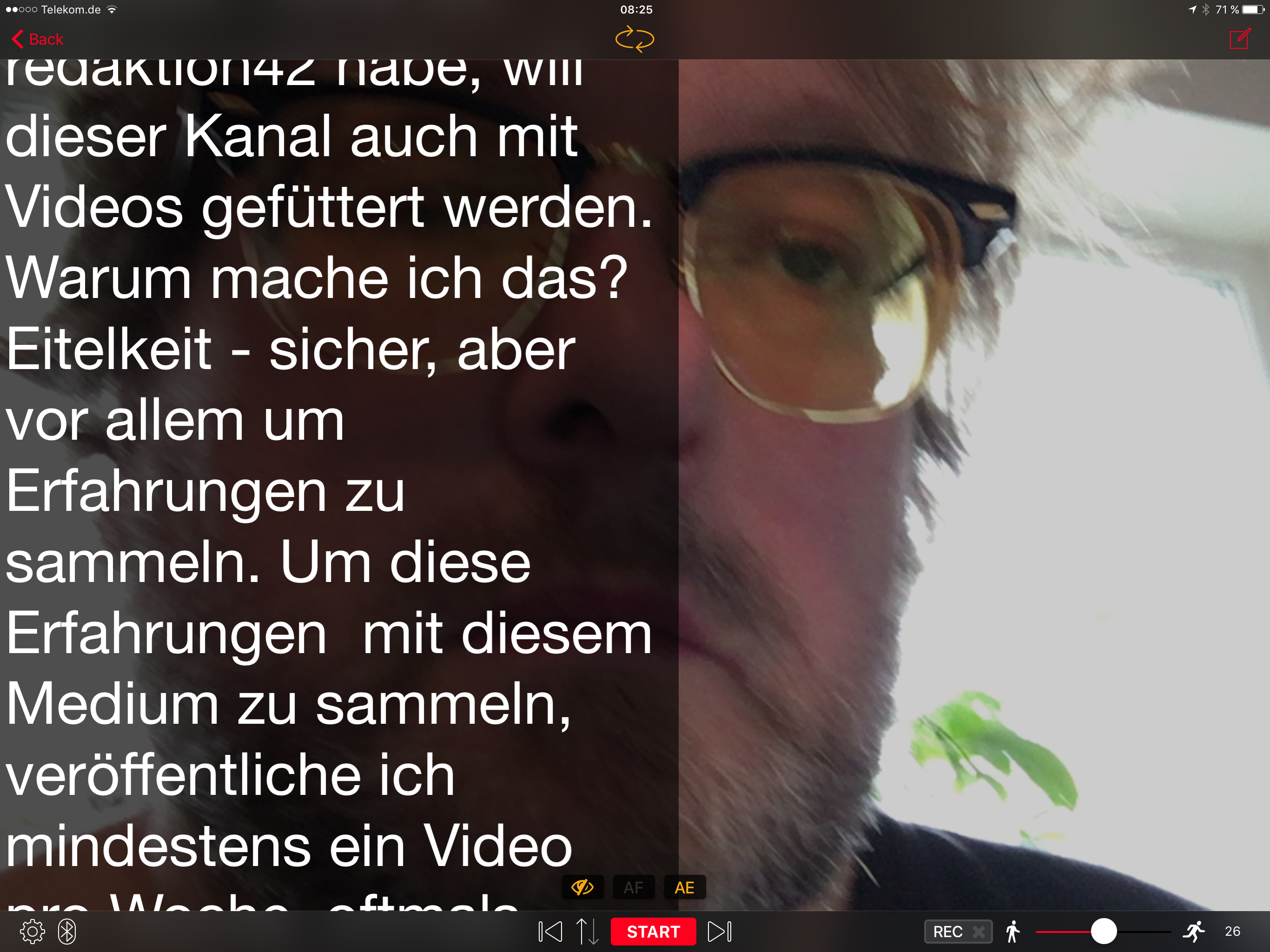 Der Telepromter von JoeAllenPro Limited ist vor kurzem in einer neuen Version erschienen und komplett erneuert. Er wurde mit Features erweitert, die ich eigentlich kaum vermisst habe. Der alte Telepromter hat mir durchaus gereicht, aber ich habe das Update mitgemacht und hab nun einige Erweiterungen wie das Laden von Texten aus der Cloud oder transparente Farbflächen unter der Schrift. Ich suche im Moment noch den Countdown von früher – den habe ich beim Update nicht mehr gefunden und den brauche ich aber. Gut ist nun die Möglichkeit, den Telepromter von einer externen Blauzahn-Tastatur zu starten. Nun geht auch der Start via Apple Watch und das ist prima. Die Apple Watch steuert allerdings nur die App auf dem iPhone, nicht auf dem iPad. Ich muss mich wohl umgewöhnen, denn bisher habe ich das iPad Pro zur Videoaufnahme meist verwendet. Das iPad Pro hat allerdings eine schlechtere Kamera als mein iPhone 7 plus. Ich probiere die neuen Aufnahmen mit dem iPhone aus, das auch besser auf einem Stativ zu positionieren ist.