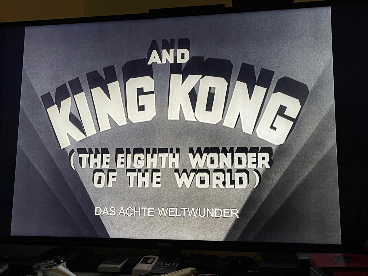 Nun kam von Filmjuwelen vor kurzem die ultimative Kong-Fassung King Kong – Das achte Weltwunder auf Bluray heraus. Ich empfehle ausdrücklich die Special Edition. Selbstverständlich musste ich zugreifen und ich hab es nicht bereut. Ich feierte einen ganzen Tag lang die hervorragende Veröffentlichung, die ich jeden Filmfreund ans Herz legen möchte. Der Inhalt der Doppel-Bluray King Kong – Das achte Weltwunder kann sich sehen lassen: Enthalten sind die Filme King Kong und die weiße Frau (1933), King Kongs Sohn (1933) und Panik um King Kong (1949). King Kongs Sohn hatte ich bisher nur auf Super 8 und die Tricks sind prima. Panik um King Kong finde ich eher schwach. Zudem ist die colorierte Kong-Fassung enthalten, die ich bisher in besserer Version auf US-Laserdisc hatte und als besonderes Schnäppchen die verschollen geglaubte deutsche Fassung von 1933 Die Fabel von King Kong in toller Sychro mit deutscher Einleitung.