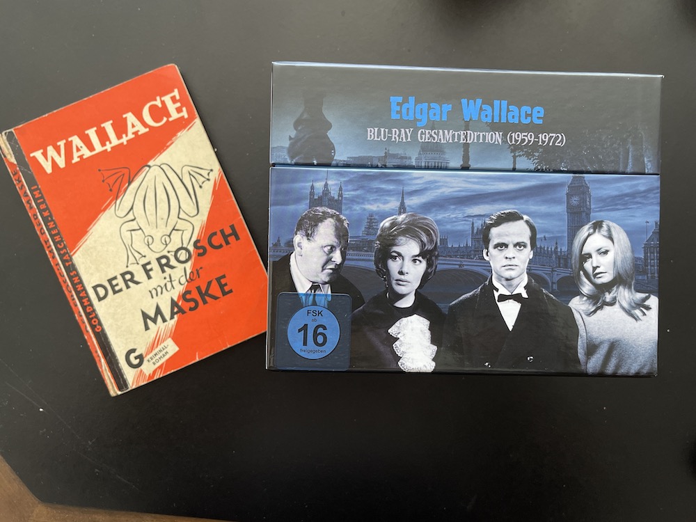 Ich fand bei mir noch vom Goldmann-Verlag den Band Nummer 1 mit dem Titel Der Frosch mit der Maske. Die Kindle-Ausgabe ist inzwischen kostenlos. Der Roman wurde im Jahr 1925 geschrieben und erlebte seine deutsche Verfilmung von Harald Reinl in Schwarzweiß im Jahre 1959. Ab 1961 kümmerte sich Horst Wendland um die Wallace-Filme und führte sie in Deutschland zu einem Publikumserfolg. Im Grunde finde ich die Wallace-Rialto-Filme in Schwarzweiß am reizvollsten. Ab 1966 gab es mit dem Buckligen von Soho den Edgar Wallace in Farbe. Meiner Meinung ließ aber auch damit die Qualität der sowieso seichten Filme noch mehr nach. Im Jahr 1972 wurde die Rialto-Reihe mit dem Rätsel des silbernen Halbmondes eingestellt. Wallace-Filme gab es noch von anderen Produktionsgesellschaften, aber in dieser Box sind die 32 Rialto-Filme von Horst Wendlandt enthalten. Zudem gibt es ein extrem gutes Booklet mit tollen Kinopostern.