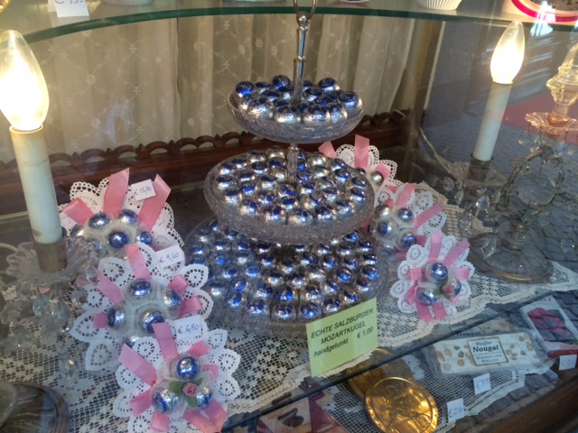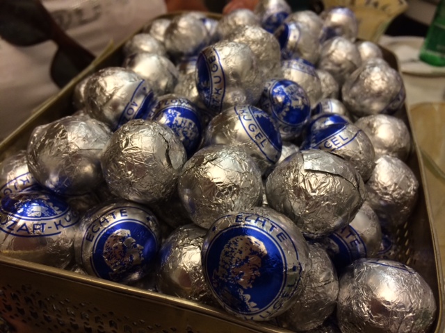 Ich war jetzt einige Mal in der Konditorei und habe verschiedene Mehlspeisen probiert. Allesamt herrlich. Aber natürlich weltberühmt sind die Mozartkugeln. Die Mozartkugeln werden in eigener Produktion handgetunkt und von Hand in silber-blaues Staniolpapier gewickelt.