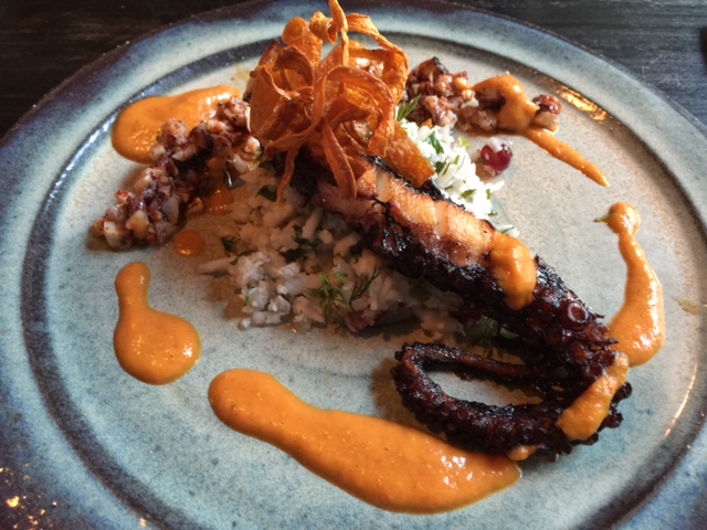 Nach einem wunderbaren Gruß aus der Küche wählte ich als Vorspeise den Oktopus mit fermentierten Blumenkohl Tabouleh mit Orangen-Minze-Paprika-Coulis.
