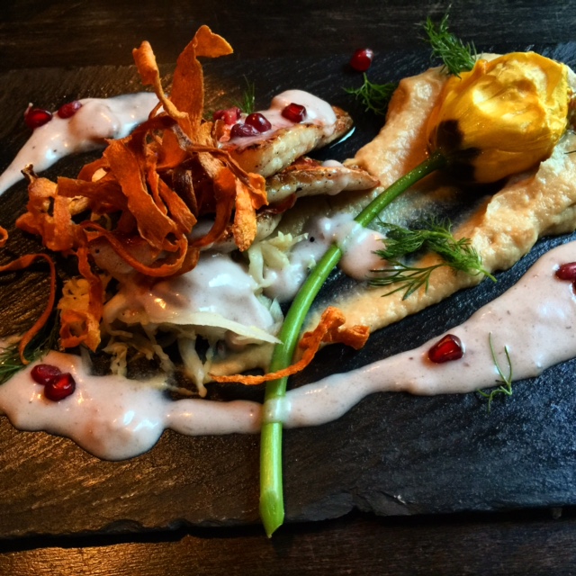 Als Hauptgang gab es für mich ein rotes Meerbarbenfilet. Der Fisch ist klein und persönlich empfand ich ihn als etwas trocken. Die Meerbarbe wird sehr schnell gar. Dazu gab es eine gedünstete Tulpe mit Safran (ausgezeichnet) und Tapioka gefüllt, Blumenkohl-Zitronengras-Püree, geräucherte Muscheln und eine fünf-Gewürze-Kokosnuss-Sauce.