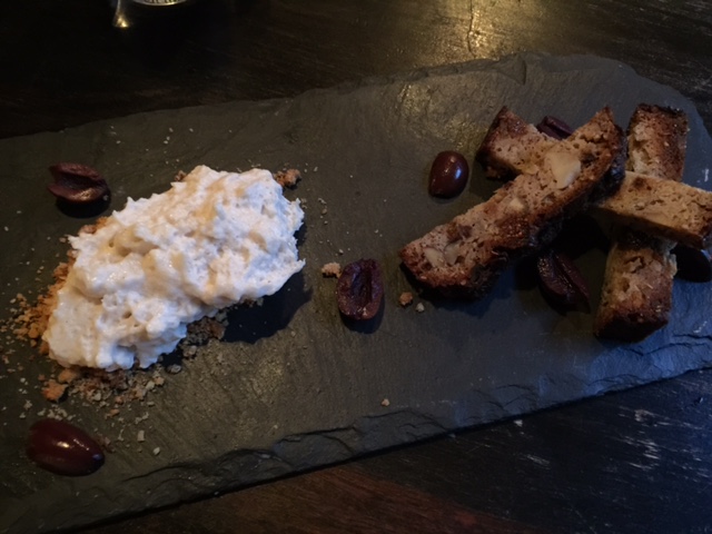 Zur Nachspeise wählte ich eine Kombination aus Spargel-Kakaobutter-Vanille-Mousee mit süßen Kalamata Oliven und Haselnuss-Lebkuchen.