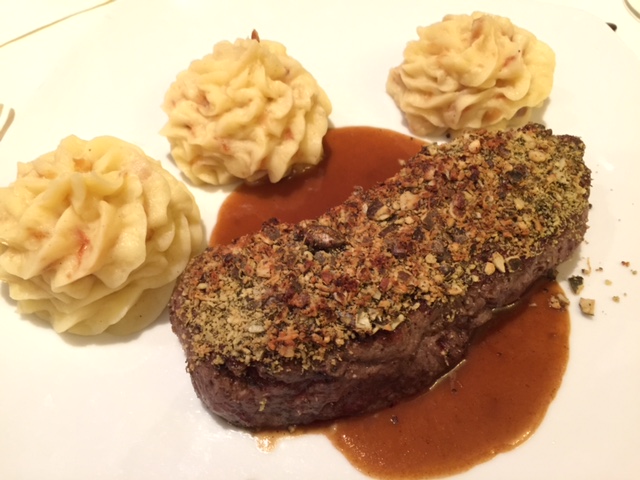 Skrei war zwar angekündigt in der Speisekarte. Aus dem hervorragenden Fisch wurde dann eine Goldmakrele – allerdings zum Preis von einem Skrei. Wirklich hervorragend und für mich der Gewinn des Abends war Dashi, Paprika und Rettich.