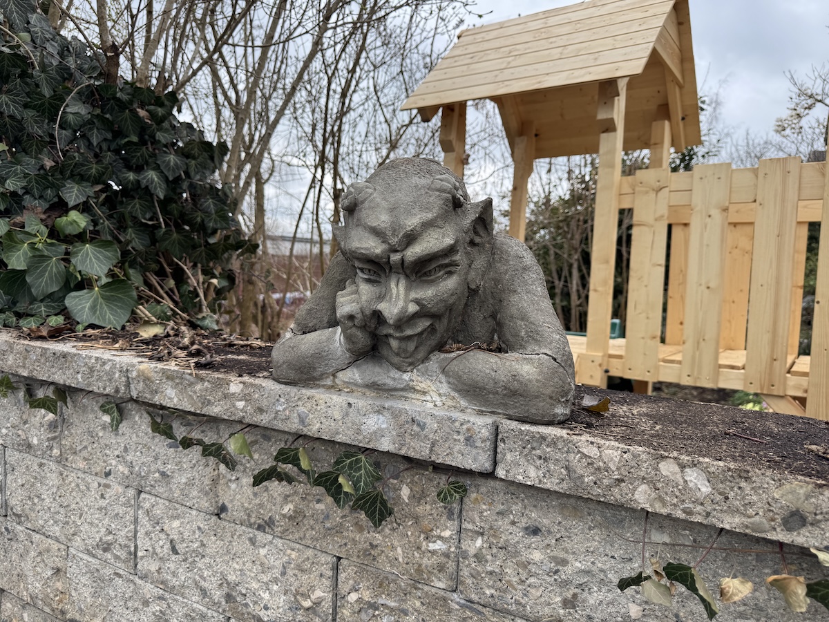 Nun, bei uns steht die Figur auf einer Gartenmauer und nicht an einer gotischen Kathedrale – aber das sind Details.