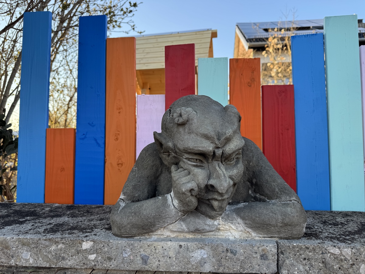 Nach ein paar Tagen ergänzte der neue Hausbesitzer einen farbigen Gartenzaun hinter der Figur. Ich mag die Farben. Immer wieder bleibe ich vor der Figur stehen. Für mich ist sie karikaturartig, grotesk, mit Anklängen an mittelalterliche oder barocke Fratzen. Die herausgestreckte Zunge und die gelangweilte Pose wirken auf mich ironisch, spöttisch oder sogar boshaft – typisch für sogenannte „Grotesken“ oder „Maskarons“.