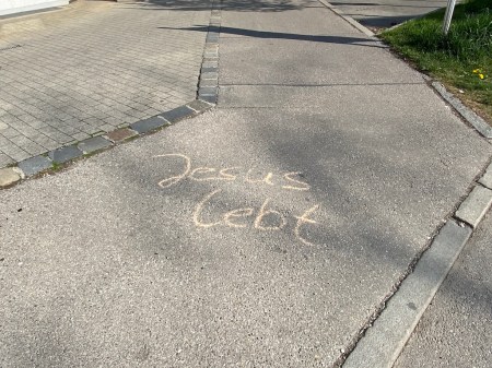 Als ich am Ostersonntag vor die Tür trat, traf ich in Maisach auf einen Ostergruß in Form von Kreidesprüchen auf den Straßen und Wegen. „Der Herr ist auferstanden“ (nicht aufgestanden), „Jesus lebt“, „Frohe Ostern“ oder „Halleluja“ war zu lesen. Eines der Hochfeste der Christenheit wurde anders als sonst in unserem Dorf begangen.