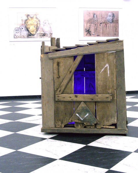 Im Mittelpunkt der Gestaltung jeden Bauwerks steht die Bauhütte. Und diese Bauhütte steht auch im Mittelpunkt der Ausstellung. Sie ist gewissermaßen das Labormodell für die Realisierung seines Bauplans. In ihrem Schutz kann geplant und widerlegt, gefertigt und verworfen werden, ohne dass das Sehnen des Ausführenden auf dem Jahrmarkt der Öffentlichkeit zerredet wird. Aus alten Scheunenbrettern wurde die Hütte gezimmert und mit Symbolen der Freimaurer verziert. Die Hütte hat die Größe einer Hundehütte. Im Inneren ist die Hütte mit blauem Licht beleuchtet. Es finden sich Kopien verschiedener Baupläne darin. Lesen oder erkennen konnte ich nicht wirklich etwas. Das ist wahrscheinlich System: Das Geheimnisvolle, was die Freimaurer umgibt.
