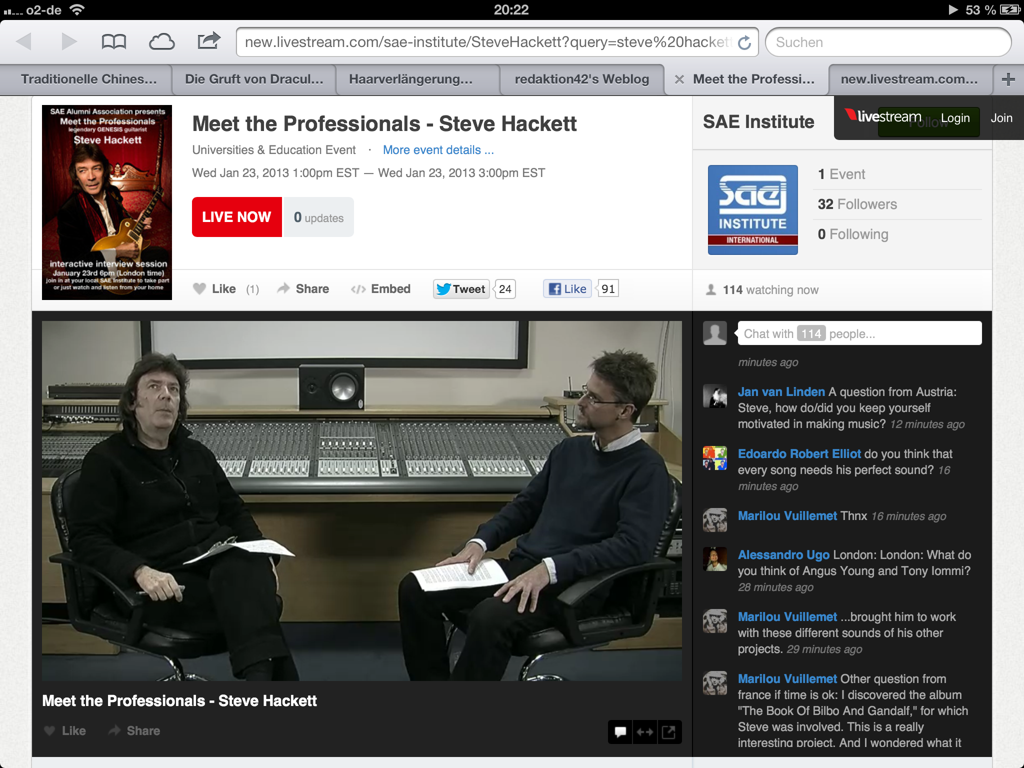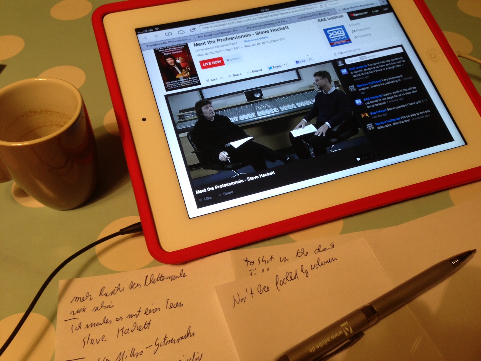 Und heute? Heute sitze ich mit einer Tasse Kaffee vor dem iPad und klinke mich in einem Livestream ein. In diesem Fall saß Steve Hackett in einem SAE-Studio in London und beantworte die Fragen des Moderators und der Gäste, die via Chat Fragen stellen konnten. Die Fans konnten wirklich fragen, was sie interessiert und nicht dass, was ein Journalist glaubt, dass die Fans interessiert. Hier liegt ein bedeutender Unterschied. Das Internet fördert die Demokratie.