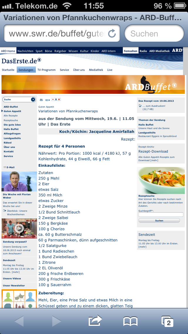 Eine interessante Verbindung zwischen Online und Fernsehen praktiziert praktiziert derzeit die ARD. Eigentlich wollte ich mir den Livestream von Obama ansehen, aber der US-Präsident ließ sich noch ein wenig Zeit. Stattdessen kam ARD Buffet, eine leichte Boulevard-Sendung im Ersten. Dort gab welchen Jacqueline Amirfallh Rezepte von Pfannkuchenwraps.