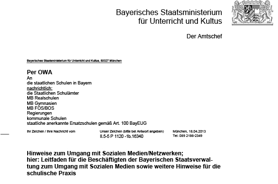 Aber mit der ganzen Kommunikation via Web 2.0 soll jetzt Schluss ein. Am 18. April 2013 ging ein Hinweis des bayerischen Kultusministeriums an die Schulen. In einem Schreiben des Amtschefs (hier zu laden) an die Schulen heißt es: „Dabei ist besonders hervorzuheben, dass angesichts enger datenschutzrechtlicher Grenzen Soziale Netzwerke zum Beispiel Facebook, Twitter für den Austausch dienstlicher Daten nicht geeignet sind.“ Und auch ein Facebook-Auftritt der Schule sei ein Problem für das Ministerium. Wörtlich heißt es: „Auch ein Auftritt der Schule in bzw. ein Konnex zu diesen Netzwerken (Profile, Fan-Seiten, Like-it-Buttons) ist rechtlich problematisch und hat daher zu unterbleiben.“ Und es wird noch besser: Entsprechendes gilt für die dienstliche Verwendung von Webseiten durch Lehrkräfte und sonstiges schulisches Personal (zum Beispiel Blogs).“