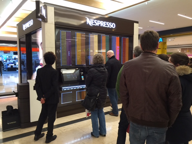 Der Automat hat zwei Terminals, obwohl einer bei meinem Besuch außer Betrieb war. Ein freundlicher Nespresso-Mitarbeiter unterstützt die Kunden beim Kauf ihrer Kaffeekapseln. Er erinnert mich an die Mitarbeiter bei Lufthansa, die beim Self-Check-in bereit stehen, um einzugreifen, wenn der Passagier mit dem Automat überfordert ist.