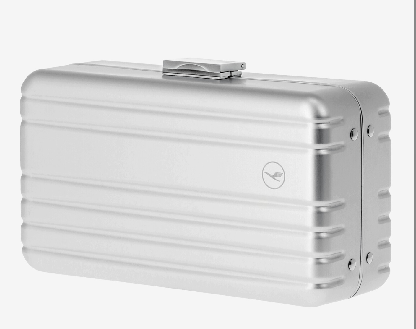 Das ist ein schönes Alu-Kästchen in dem die Lufthansa den Passagieren der Ersten Klasse eine Zahnbürste, Cremes, Ohrenstöpfel und weitere Annehmlichkeiten schenkt. Ich musste dafür 22.000 Meilen oder 79 Euro hinlegen. Ich hatte so ein Amenity-Kit mal von Sabena, aber das ist lange, lange her. 2001 ging die belgische Sabena pleite. Das Alu-Teil von Lufthansa fasst zwei Liter und hat die Größe von 20 x 11 x 7 cm. Es bringt 300 Gramm auf die Waage und ist vollkommen aus Aluminium. Es wird beschrieben als multifunktionales Reiseaccessoire passend zur Lufthansa Aluminium Collection.