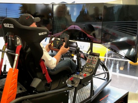 Ich sah eine große Traube von Menschen und nährte mich interessiert. Aber das Interesse der Besucher galt keinen Automobil, sondern einer Rennsimulation. sim4race hatte einen Rennsimulator aufgebaut, der es in sich hatte. Drei große Bildschirme zeigen ein realistisches Bild einer ausgewählten Rennstrecke. Hier war es freilich der Nürburgring.