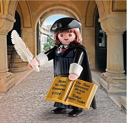 Bei mir auf dem Schreibtisch steht ein kleiner Martin Luther von Playmobil. Das kleine Plastik-Vorbild ist der Renner: Schwarzer Talar und ein Federkiel in der Hand, der Mini-Martin Luther ist 7,5 Zentimeter groß und ist ein echter Hit.Im Juni ist die millionste Figur des mit Federkiel und aufgeschlagener Bibel dargestellten Reformators ausgeliefert worden, teilte der Spielwarenhersteller Geobra Brandstätter in Zirndorf (Landkreis Fürth) mit. Der in schwarzem Talar dargestellte Luther sei damit die erfolgreichste Playmobil-Einzelfigur in der Geschichte des Unternehmens. Da die Startauflage von 34.000 rasch vergriffen war, musste die kleine Luther-Figur mehrfach nachproduziert werden.
