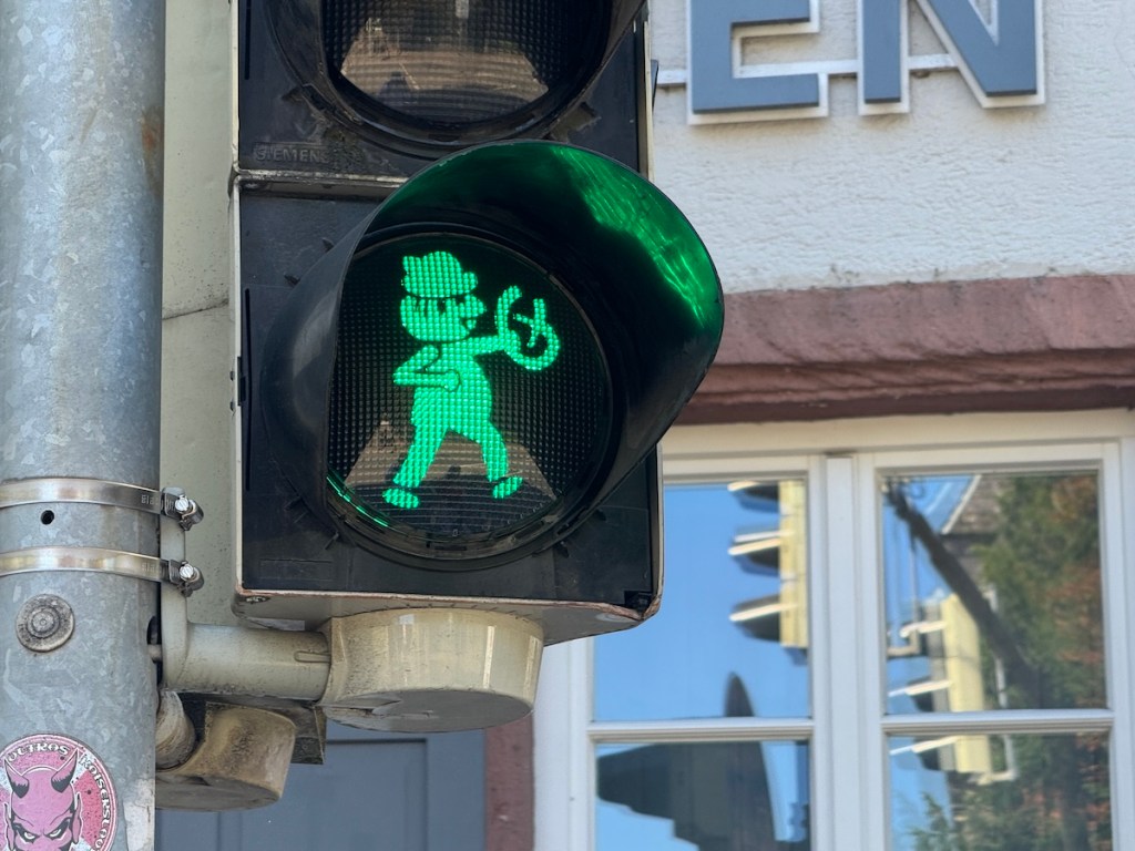 Diese ortsspezifische Gestaltung trägt zur Identifikation mit der Stadt bei – analog zu anderen Städten, die lokale Figuren wie das Weinkönigin-Motiv in Neustadt oder das Mainzelmännchen in Mainz nutzen, findet der Brezelbu zunehmend Beachtung. Verkehrspsychologische Überlegungen legen nahe, dass solche originellen Ampelmotive die Aufmerksamkeit erhöhen – das Signal wird bewusster wahrgenommen und emotional verankert. Ich wurde beim Fotografieren fast von einem Radfahrer über den Haufen gefahren, soviel zur erhöhten Aufmerksamkeit.