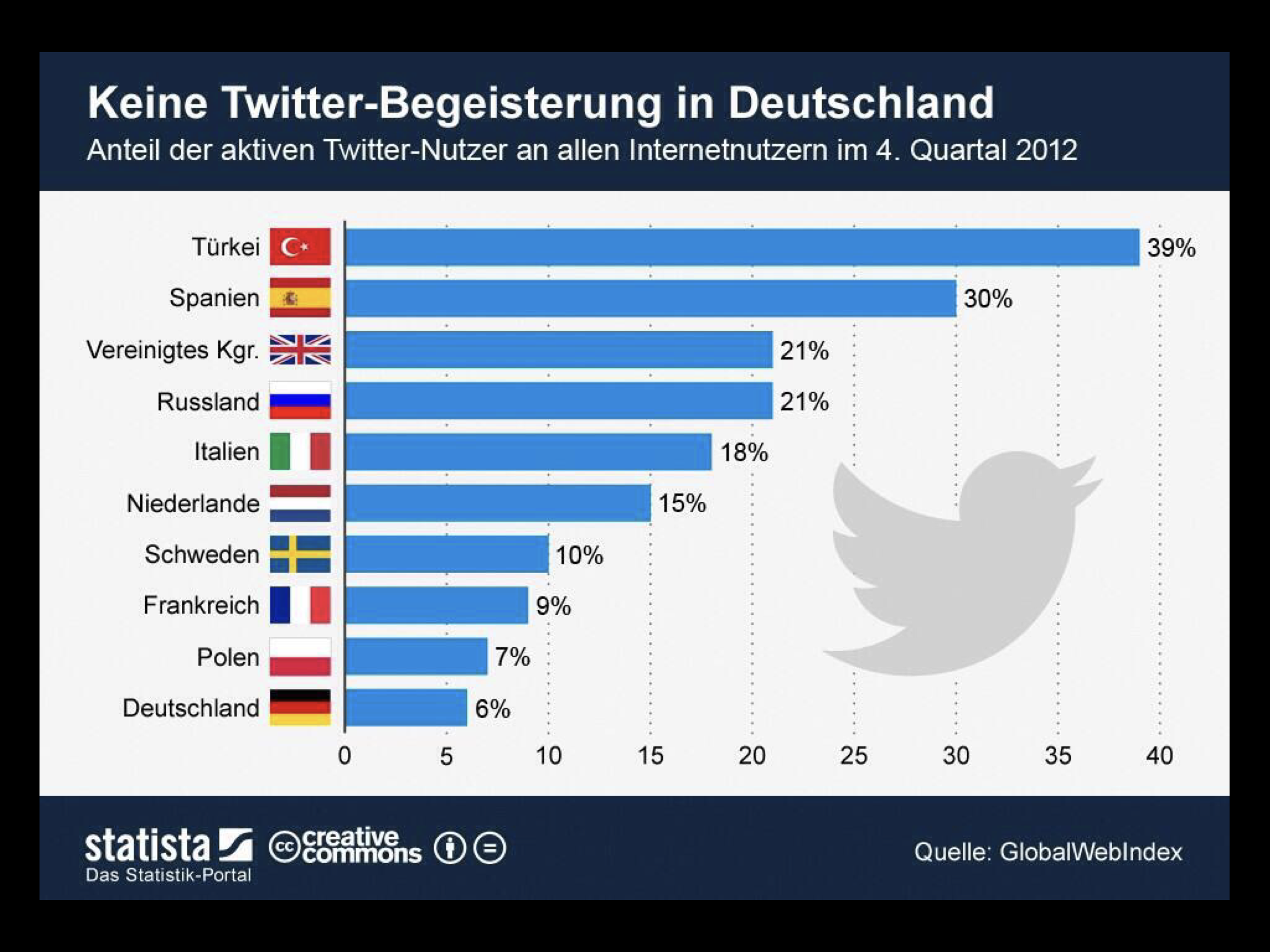 Twitter wird von den Menschen akzeptiert auf der Welt, in Deutschland hatte Twitter dagegen ein Problem. Das lag nicht daran, dass die Deutschen das Volk der Dichter und Denker sind, sondern es liegt einfach banal daran, dass unsere deutsche Sprache zu lange Worte umfasst. Donaudampfschifffahrtselektrizitätenhauptbetriebswerkbauunterbeamtengesellschaft – und meine 140 Zeichen sind voll. Englisch, Spanisch oder Türkisch hat viel, viel kürzere Wörter.