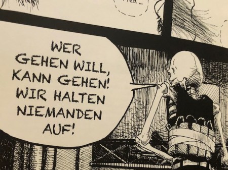 Das ist interessant, ohne Zweifel wichtig für Fred Dewilde, aber ich habe die 25 Seiten Texte nicht komplett gelesen. Es war mir zu anstrengend. Fred Dewilde ist kein Autor. Es wäre für mich sehr interessant gewesen, wenn er diese Auseinandersetzung in der Kunstform Comic verarbeitet gewesen wäre.