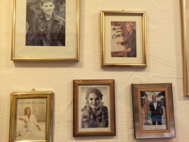 Es schauten einstmals einige Promis herein. Im Foyer des Restaurants hängt die Ahnengalerie. Als erstes fiel mit der Zeichner Oskar auf. Nur die Älteren unter uns kennen Oskar noch, der bei Dalli Dalli zeichnete. Dann lächelt auch noch Helene Fischer von der Wand und Michael Lesch, Michaela May sowie Titelhändler Konsul Weyer samt Gattin Christina Scholtyssek. Übrigens, das Bild von Hans-Hermann Weyer, wie der Konsul eigentlich heißt, ist schon mal runtergefallen und das Glas gesprungen. Ich denke, dies sagt alles über die VIP-Szene der alten Zeit. Ach ja, Farah Fawcett war auch mal da.