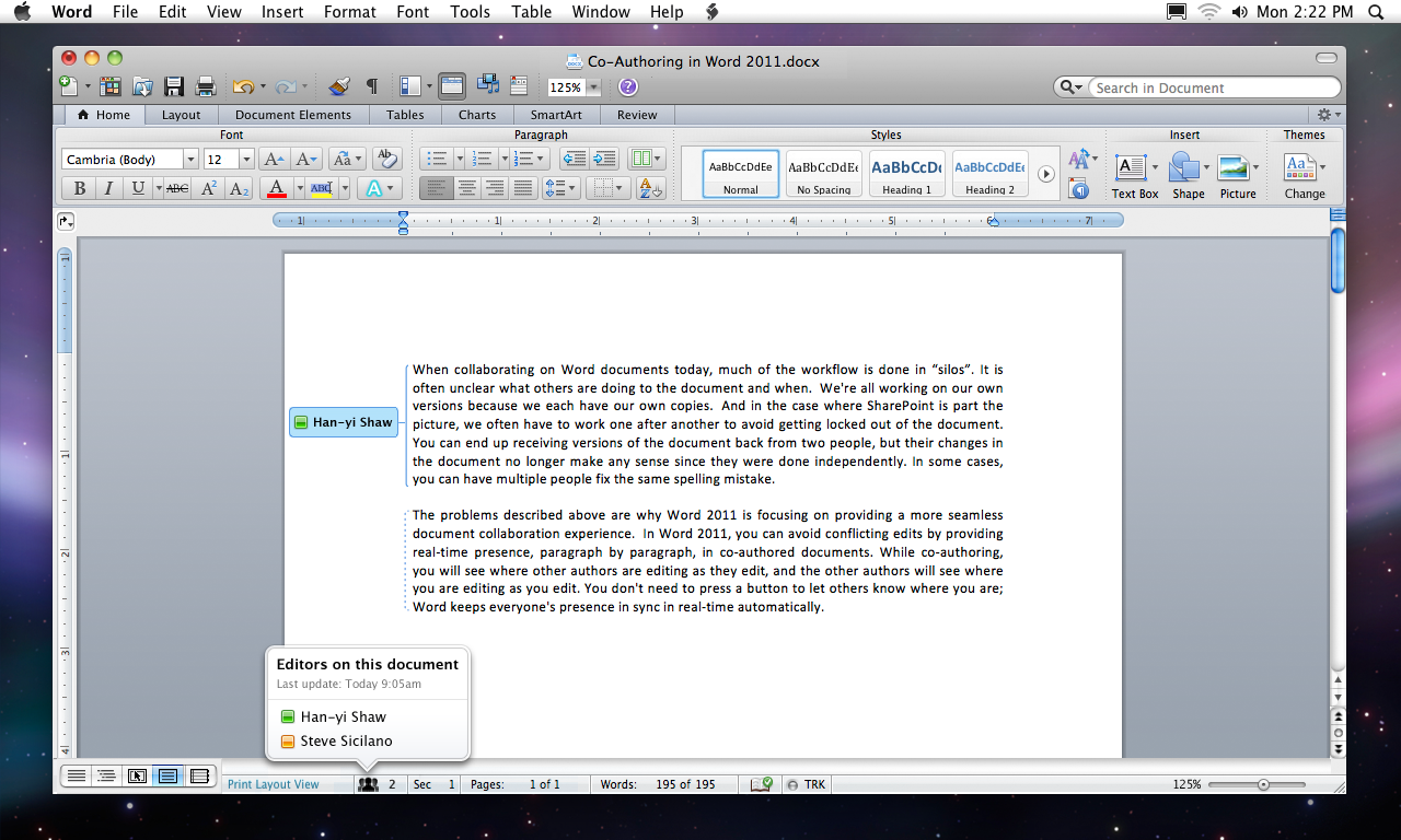 Für mich der größte Fortschritt ist gemeinsames Arbeiten an Dokumenten, ähnlich wie mit Google Docs bekannt. Mit den in Office 2011 enthaltenen Tools sollen mehrere Personen an Word-, PowerPoint- oder Excel-Dateien arbeiten, völlig unabhängig von Zeit, Aufenthaltsort oder Benutzerplattform. Das „Presence Everywhere“-Feature gibt direkt in der Anwendung Auskunft darüber, wer aus dem Team gerade im Dokument arbeitet. Die Einbindung von Microsoft Office Web Apps in Office 2011 bietet eine einfache Möglichkeit, von jedem Rechner mit einer Internet-Verbindung auf Office-Dateien zuzugreifen und diese mit anderen zu teilen. Voraussetzungen ist eine Windows Live ID oder Microsoft SharePoint.