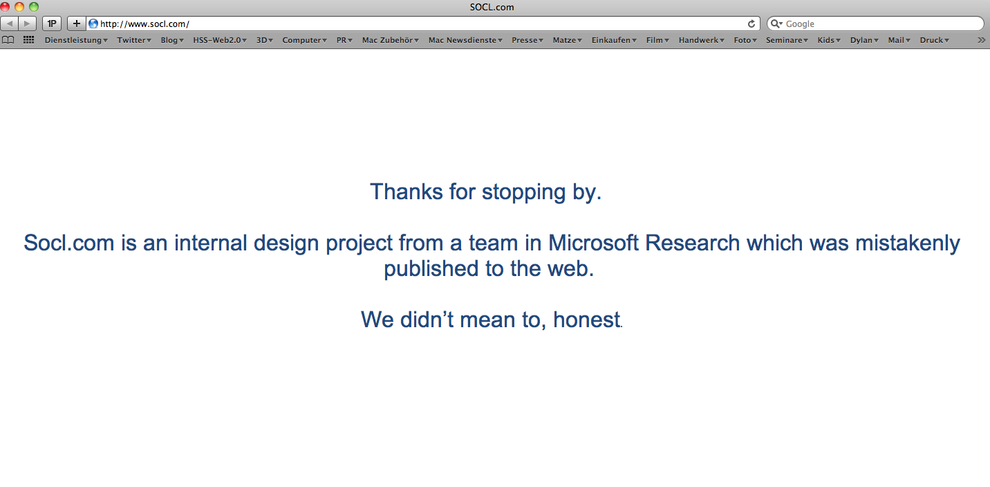 Ach ja, da gibt es auch noch Microsoft. Zufällig kam heraus, dass Redmond auch an einem Sozialen Netzwerk arbeitet – zu spät, wie ich finde. Das Ding heißt Tulalip. Es war ein Hinweis darauf kurzzeitig online. Das Tool soll helfen „zu finden was man sucht und dieses mit anderen zu teilen“. Die Idee war unter socl.com kurzzeitig zu sehen, ist aber inzwischen vom Netz genommen mit dem Verweis, dass es nur ein internes Projekt von Microsoft war.
