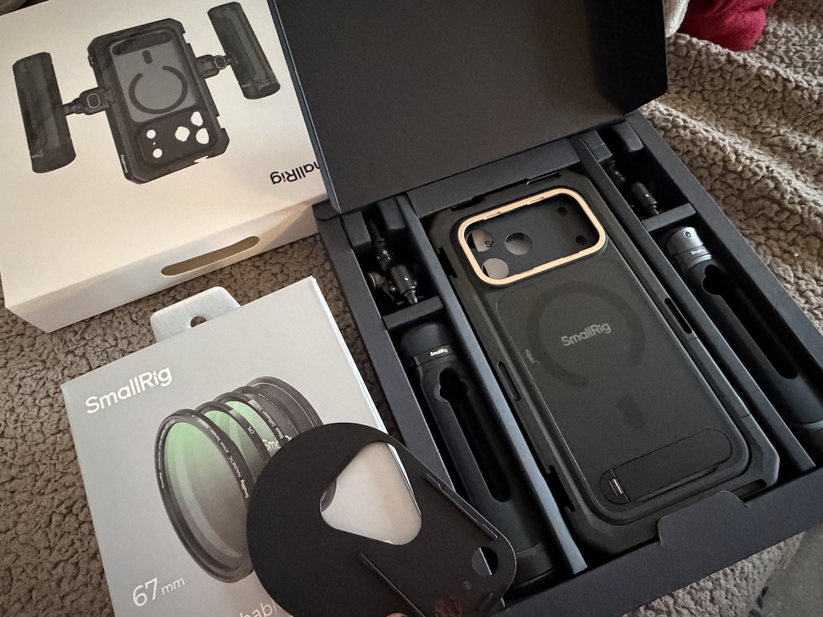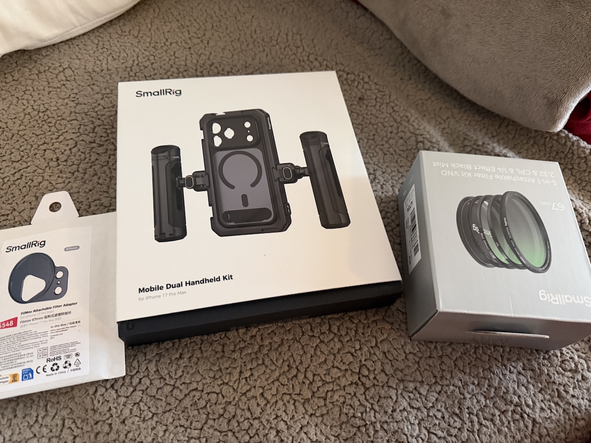 Im Moment arbeite ich viel mit dem SmallRig iPhone 17 Pro Max Dual Handheld Kit für meine Videoaufnahmen mit dem Smartphone. Ich habe noch ein größeres Case von SmallRig, aber das ist für den täglichen Gebrauch zu groß und passt nicht in meine Arbeitstasche.
