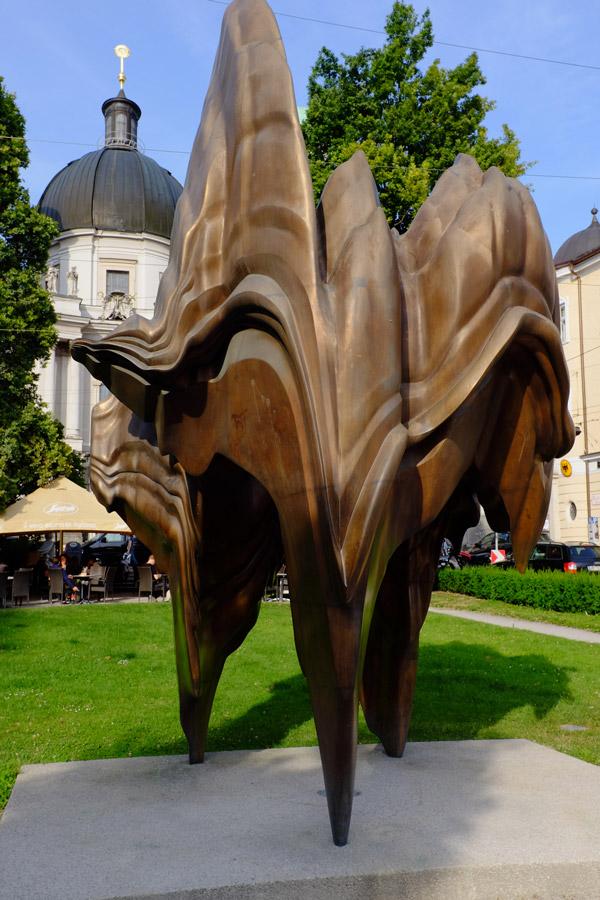 Doch, so was mache ich schon und es ist eine tolle Erfahrung im Kunstwerk zu stehen und die Welt wahrzunehmen. Es ist eine Landschaft aus Bronze. Wie tektonische Schichten schieben sich die Formen ineinander. Der Künstler wollte eine mentale Landschaft schaffen, das ihm gelungen ist. Ich habe nachgelesen, dass der britische Künstler Anthony Cragg auch auf die Kessellage von Salzburg hinweisen wollte – nun gut.