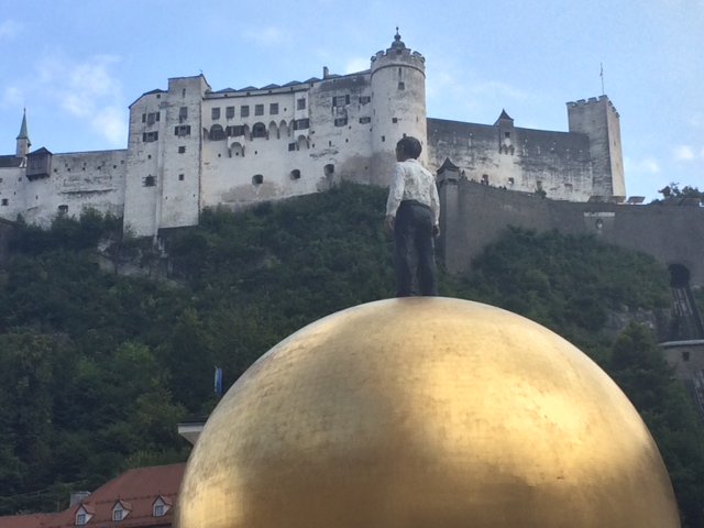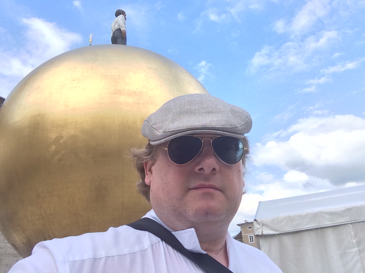Bei meinem jüngsten Besuch dieser schönen Stadt saß ich ein wenig auf dem Kapitelplatz herum, ruhte aus und beobachtete das Festspieltreiben. Irgendwie hab ich dabei die Skulptur Sphaera von Stephan Balkenhof erst einmal übersehen. Erst beim Verlassen des Platzes sah ich die Goldene Kugel. Wie konnte ich nur dieses Kunstwerk übersehen?