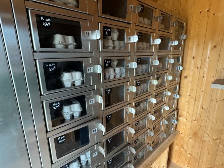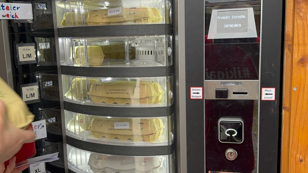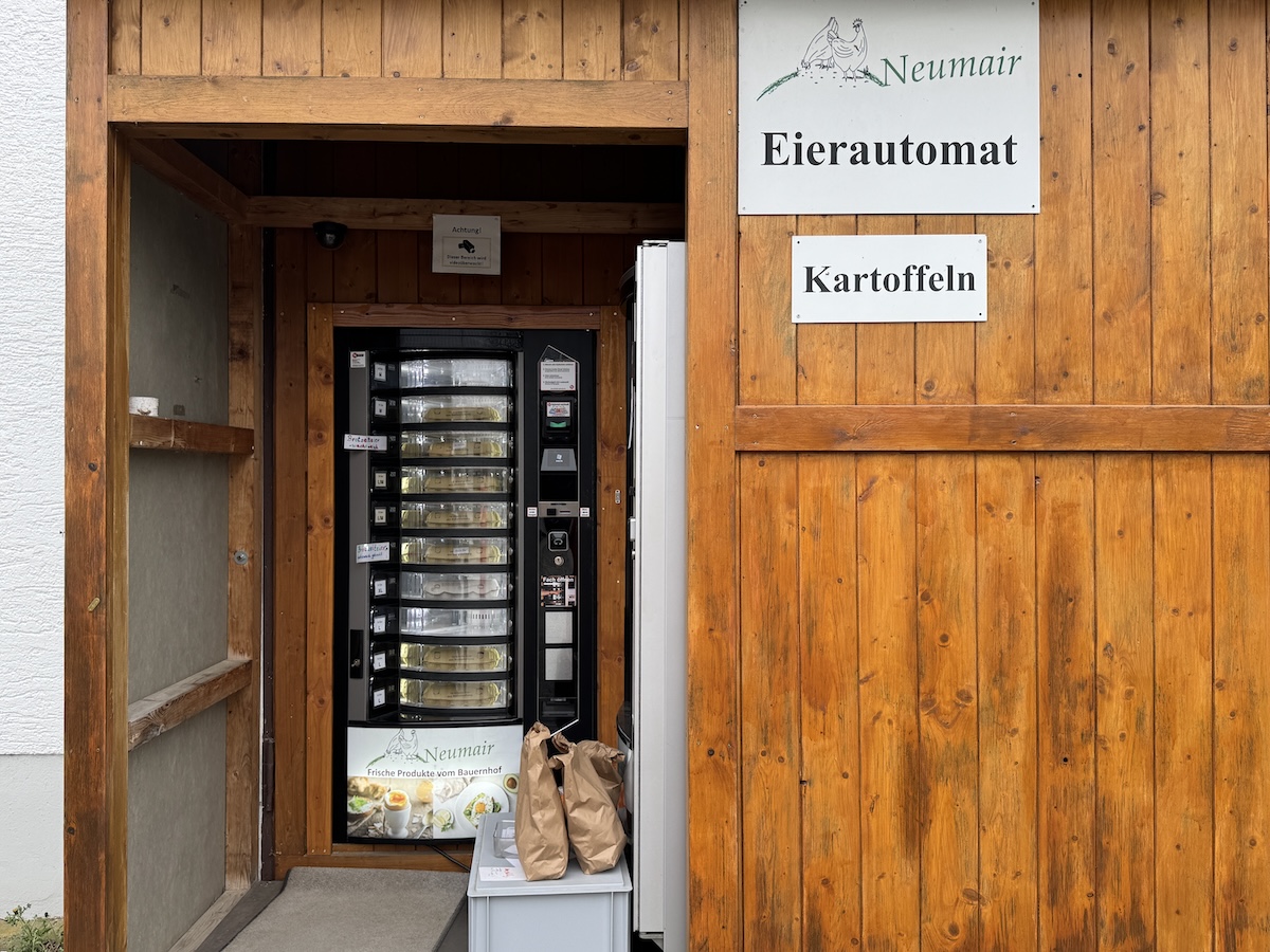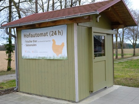 Wir holen unsere Eier vom Wochenmarkt und haben bei uns auf dem Land auch zahlreiche Eierautomaten von Landwirten in unserer Umgebung. Gerade zu Ostern füllen die Bauern die Automaten mehrmals täglich auf – ein gutes Geschäft für den Eiermann.
