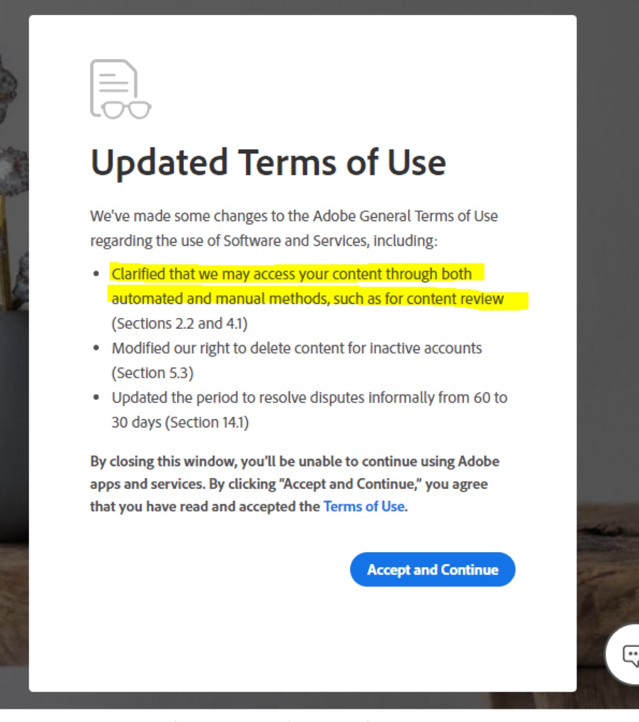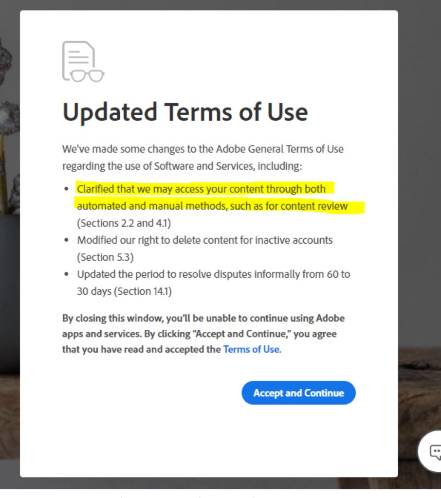 Man ist als US-Nutzer gezwungen, den AGB zuzustimmen, sonst verweigert die Cloud-gesteuerte Software ihren Dienst. Künftig sollen die Kreativprodukte des Users automatisch durch Algorithmen geprüft werden. Hinzu kommt auch eine mögliche manuelle Analyse durch Adobe-Mitarbeiter. Und es kommt noch besser: Es sind maschinelle Lernanalysen der produzierten Inhalte vorgesehen. Adobe gehts noch?
