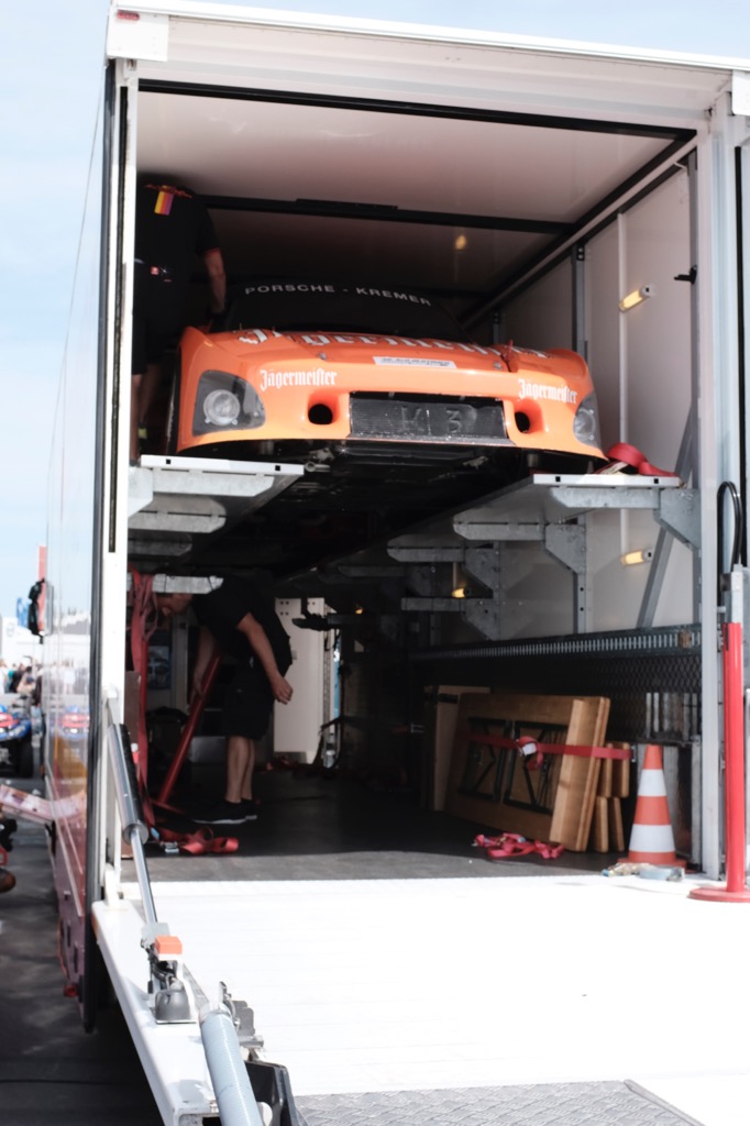 Nach dem Rennen wurden die Fahrzeuge überprüft, gewartet und in Lkws verladen. Die Rennboilden wurden nicht in klassische Autotransporter verladen, sondern hatten spezielle Anhänger.