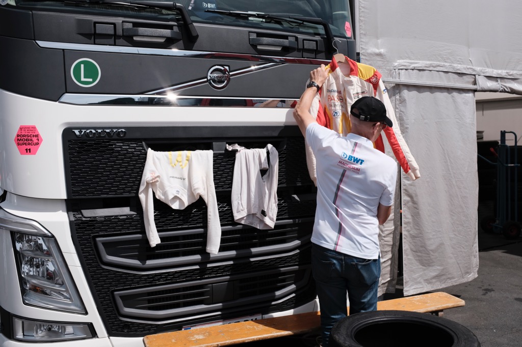 Als ich eine Abkürzung durch die Lkw-Gassen nahm, konnte ich einen Blick hinter die Kulissen werfen. Ich wusste nicht, ob ich mich einfach durch die Lkw-Reihen schlängeln durfte, ich hab es einfach getan. So stand ich bei einem Masseur, der einen Fahrer durchknete. Ich nickte freundlich zu, verzichtete aber auf Fotos, das war mir zu sehr der Privatbereich der Fahrer. Nett fand ich allerdings, als ein Mitarbeiter dass durchschwitzte Renndress und -Anzüge zum Trocken einem Kühler eines Lkw aufhängte.