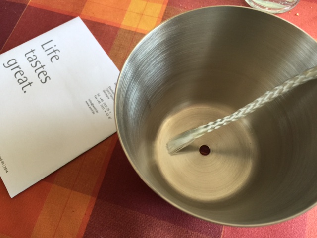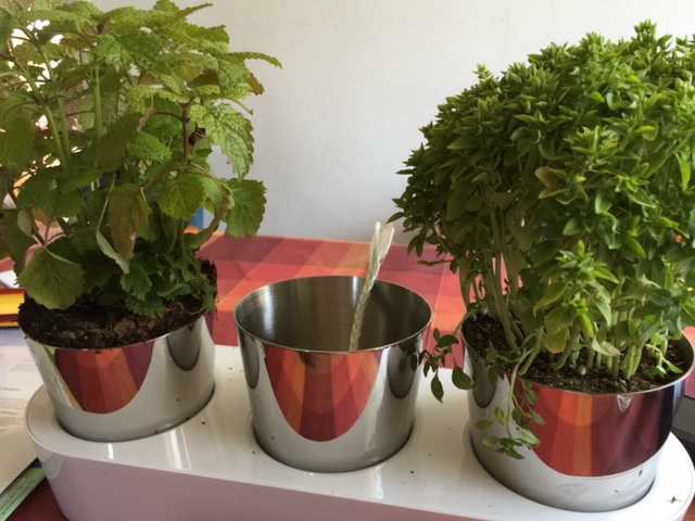 Die Töpfe sind aus spülmaschinenfesten Edelstahl und haben an der Unterseite ein Loch. Hier kommt ein mitgelieferter Glasfaserdocht durch. Die Pflanze mit ihrem Wurzelballen kommt dann in den Edelstahltopf und ich muss darauf achten, dass der Docht die Erde berührt. Anschließend kommt der Topf in den Plastikbewässerungstank, der zu zwei Drittel mit Wasser gefüllt wurde. Der Glasfaserdocht saugt das Wasser aus dem Tank an und versorgt die Kräuter. Der untere Teil des Dochtes muss freilich im Wasser liegen, nur dann ist die Funktionsweise des Bewässerungssystems gewährleistet. Das Ganze verhindert eine Über- oder Unterdosierung und ich kann beruhigt auf Reisen gehen.