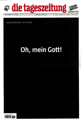 Der Papst ist aber ein Medienstar und ich glaube, das war absolut nicht seine Welt. Er war wohl eher ein Mann der Gedanken. Aber ich freute mich als Deutscher, dass nach rund 500 Jahren wieder ein Landsmann auf den Thorn Petris saß. Als Joseph Ratzinger am 19. April 2005 zum Papst gewählt Papst wurde, lachte ich mich über zwei geniale Zeitungsschlagzeilen: Die BILD titelte genial „Wir sind Papst“ und die taz aus Berlin schrieb „Oh mein Gott“.