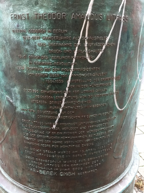 Plötzlich stand sie vor mir: Die Litfaßsäule-Säule. Das einst wichtigste Instrument der Außenwerbung stammt aus Berlin und wurde von Ernst Litfaß erfunden. Am 27. Dezember wird sein 140. Todestag begangen. Mal sehen, ob sich die Werbebranche an ihn erinnert und ihm gedenkt. Es wäre auf jeden Fall wichig. Beim Spaziergang durch Ostberlin stand ich auf einmal vor dem Litfaß-Denkmal in der Münzstraße nahe dem Alexanderplatz. Leider war das Denkmal mit Farbe beschmiert. Wer die älteste Litfaßsäule in Berlin sucht, der findet sie übrigens am Berliner Mexikoplatz.