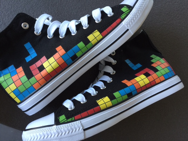 Nach meinem fulminanten Pac Man-Anzug habe ich als Retrogamer etwas dezenteres gefunden, um auf mein Retro-Hobby aufmerksam zu machen: Tetris-Turnschuhe.