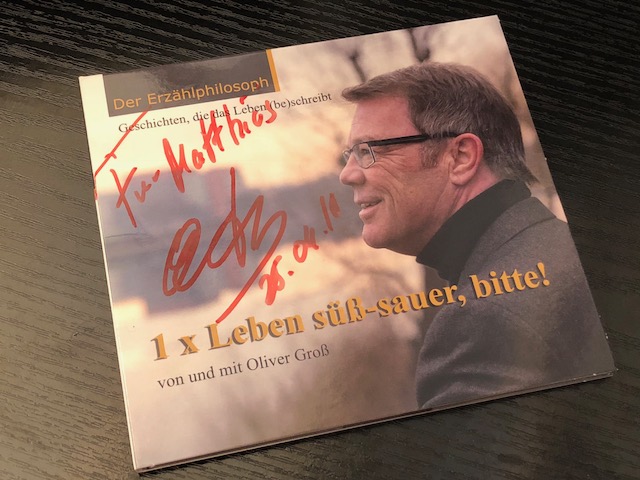 Bei meiner jüngsten Begegnung mit Oliver Groß drückte er mir seine erste CD samt Widmung in die Hand. Der interessante Titel „1x Leben süß-sauer, bitte!“ – klingt witzig und erwartungsfroh hörte ich mir die Silberscheibe an. Und ich bekam genau den Oliver Groß mit seinen Geschichten, wie ich ihn kenne. Humorvolle, hintergründige Geschichten eines Erzählphilosophen, die mir Freunde gemacht, aber mich auch zum Nachdenken angeregt haben.