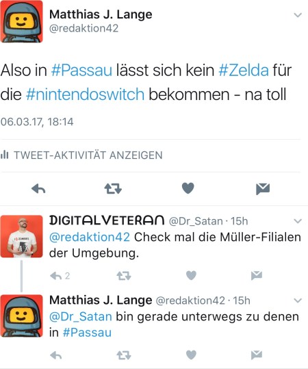 Da ich auf Reisen bin und derzeit in Passau auf einem Seminar weile, versuchte ich es im örtlichen Einzelhandel. Mein erster Stopp war die Stadtgalerie, eine Art Einkaufszentrum in der Innenstadt. Beim Saturn im Untergeschoss gab es einen Stapel Zelda für die Wii U (haha), aber nur noch ein Zelda – Breath of the wild für die Switch. Aber Pech gehabt. Diese Kopie des Spiels war vorbestellt und der Verkäufer mit Piercing im Mund wollte es mir nicht verkaufen. Ich habe gebettelt, gefleht, doch der Kollege blieb hart. Gegebenenfalls komme eine Lieferung am Mittwoch nachmittag, aber da bin ich schon wieder unterwegs.