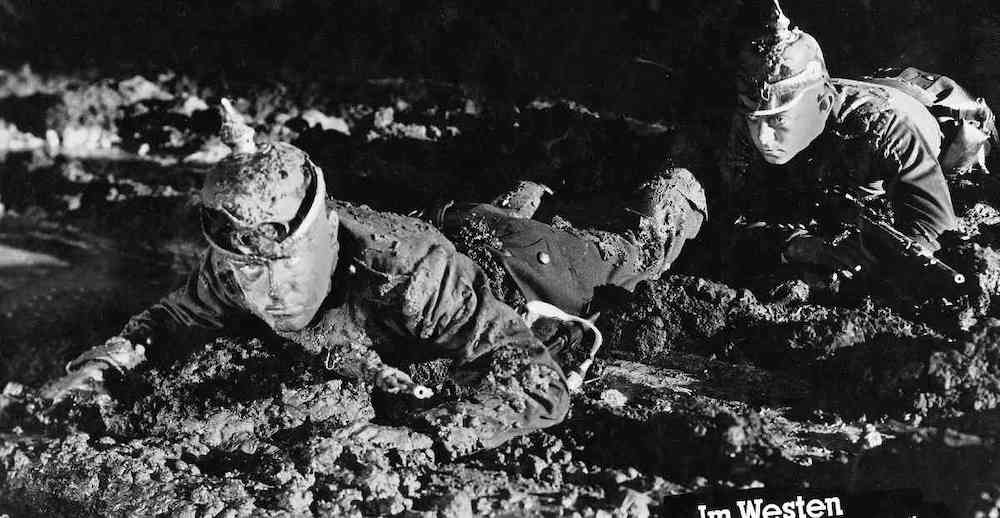 Der Erste Weltkrieg hat begonnen, das Deutsche Reich befindet sich im Rausch. Angestachelt von ihrem nationalchauvinistischen Lehrer beschließen Paul Bäumer und seine Mitschüler, sich freiwillig zum Kriegsdienst zu melden. Doch der Idealismus verfliegt schnell im Angesicht der harten Realität an der Westfront: ein zermürbender Stellungskrieg in den Schützengräben, permanentes Trommelfeuer und Maschinengewehrsalven. Statt Ruhm und Ehre wartet auf die jungen Kameraden ein dreckiges, sinnloses Sterben in einem mechanisierten Krieg.