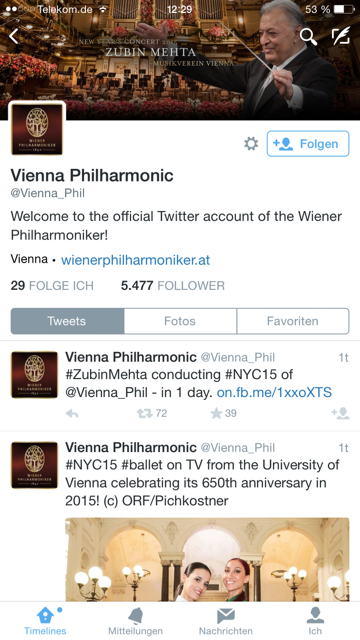 Aber und jetzt ein ganz großes ABER. Was machen die Wiener Philharmoniker daraus? Sie verschlafen eines der wichtigsten Konzertereignisse in ihrer Netzberichterstattung. Der Twitter-Account der Wiener Philharmoniker @vienna_phil hört am 31. Dezember zu twittern auf. Kein Tweet am 1. Januar während des Konzerts, kein Live-Tweet zum Neujahskonzert. Leute, ihr habt die Macht von Social Media nicht verstanden. Die Frage ist natürlich, müssen Sie überhaupt twittern? Die Hütte in Wien ist voll, übervoll. Aber wer A sagt, muss auch B sagen. Wer das ganze Jahr über twittert, der sollte auch beim Neujahrskonzert twittern. Aber nichts ist passiert. Schade, einfach nur schade. Gerne stehe ich für 2016 zur Verfügung.