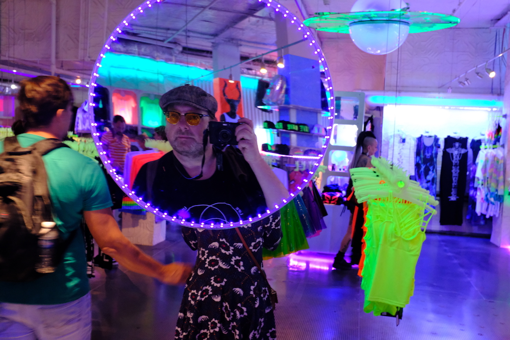 Im Cyberdog, The Stables Market Chalk Farm Road, London NW1 8AH, gab es futuristische Partyklamotten und Gadgets zu sehen. Ich habe zahlreiche Raver gesehen, die sich hier mit Szeneklamotten einkleiden. Schwarzlicht, Strobos, Laser – alles prasselt auf den Besucher ein. Die Klamotten leuchten im Beat der Musik. Es gibt sogar einen speziellen Raum für ein erwachsenes Publikum. Dort war fotografieren nicht erlaubt. Was man nicht alles aus Leder machen kann!