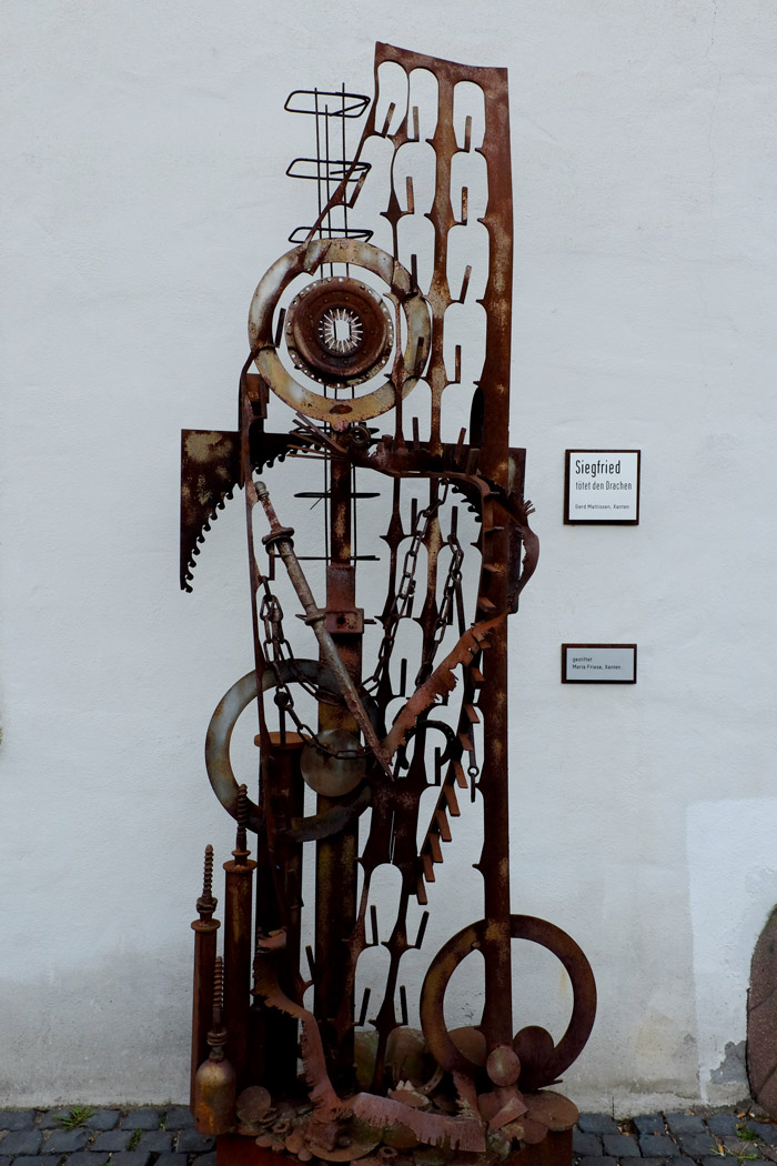 Das Motiv Siegfried tötet den Drachen wurde immer wieder in der Kunstgeschichte heroisch dargestellt. Siegfried als Held. Die Skulptur von Gerd Mattissen ist genau das Gegenteil. Siegfried hat bei ihm Rost angesetzt und eine interessante Interpretation von Mattissen.