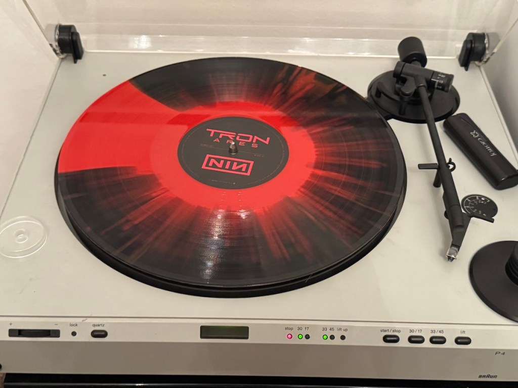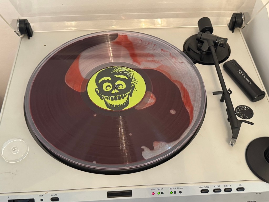 Die Vinyl ist durchsichtig und mit roter Farbe gefüllt, die sich beim Drehen bewegt – sehr originell.