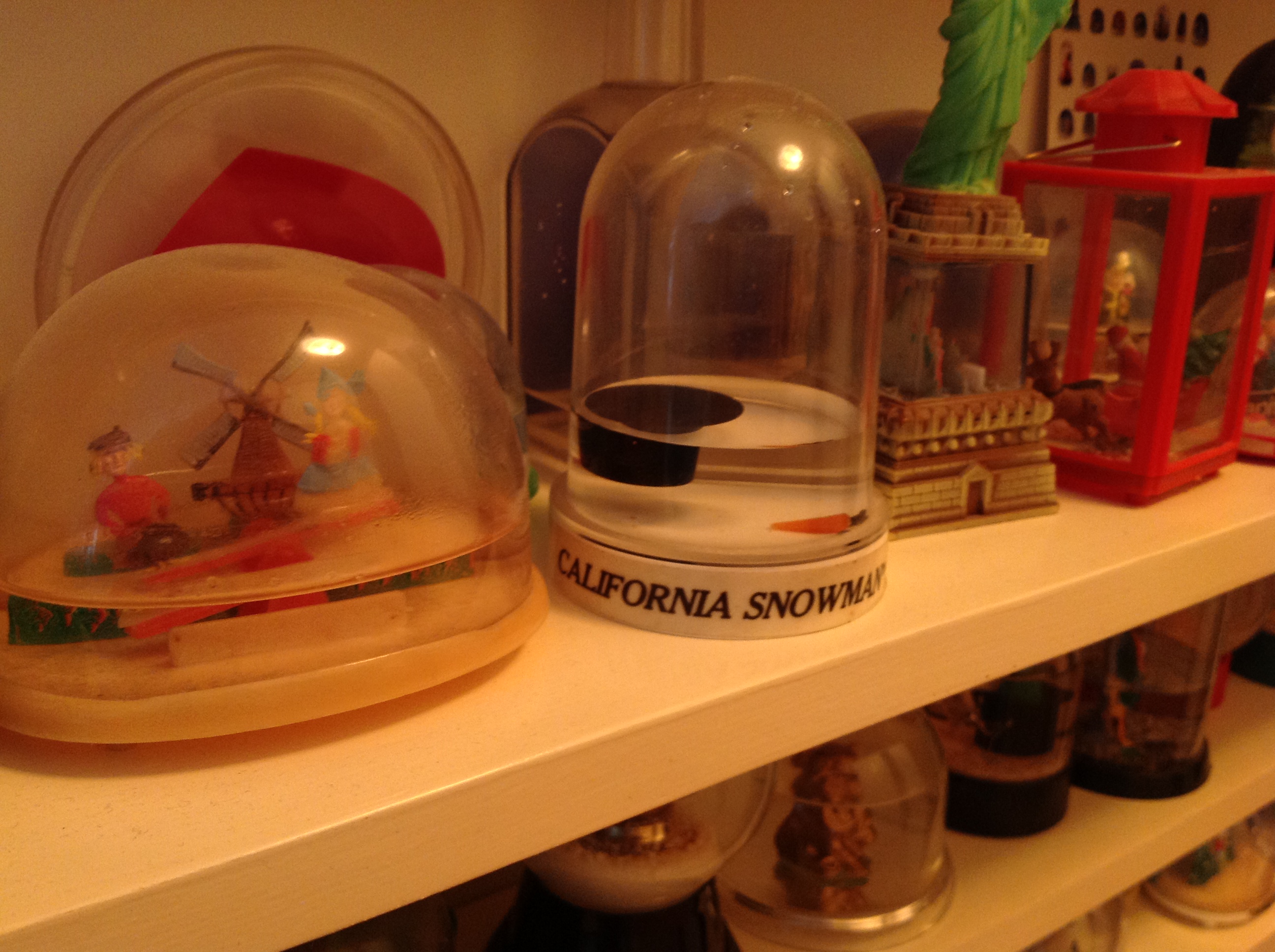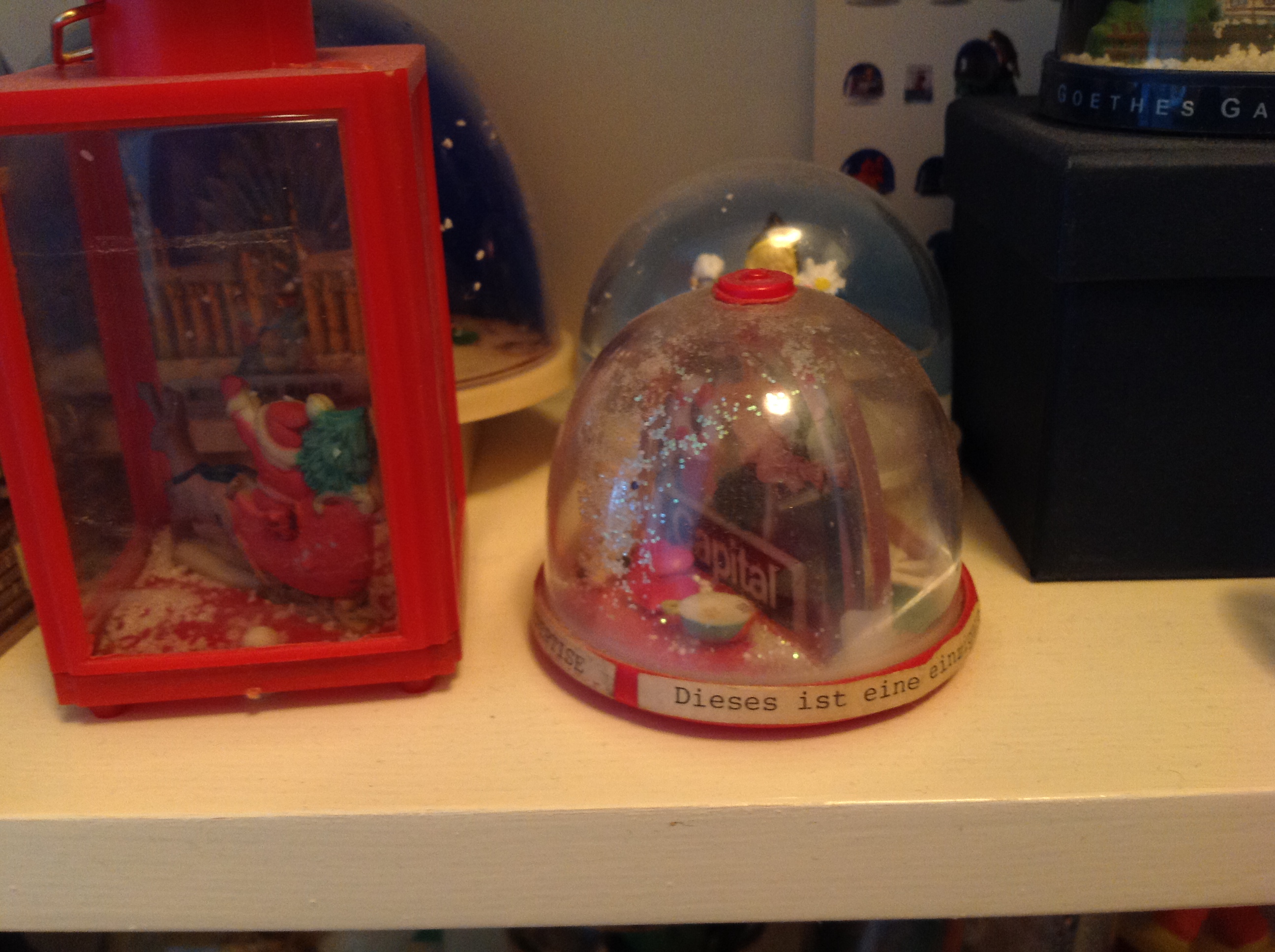 Die beiden Lieblingsschneekugeln der Sammlerin sollen dabei nicht unerwähnt bleiben. Da wäre zum einen der kalifornische Schneemann. In seiner Schneekugel befinden sich nur noch Zylinder und Karottennase – der Schneemann selbst ist in der Sonne Kaliforniens geschmolzen. Die persönlichste Erinnerung ist eine Schneekugel aus den 80er Jahren des vergangenen Jahrhunderts. Die Redaktion der Finanzzeitschrift Capital hat für die ausscheidende Kollegin extra eine Schneekugel angefertigt – ein Unikat. In den achtziger Jahren gab es noch keine Bausätze von Schneekugeln aus dem Internet oder Fotofachhandel.
