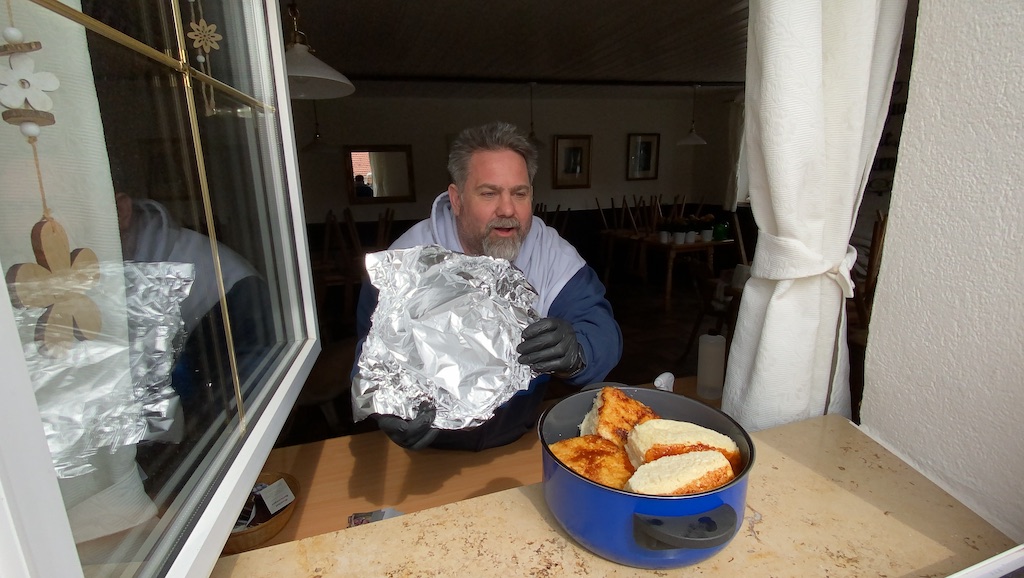 Denis Kleinknecht dagegen hat seine Speisekarte ins Netz gestellt und gibt eingeschweißte QR-Codes aus. Die Gäste können sich via Smartphone die Karte auf ihr Mobiltelefon laden und auswählen. Da wir auf dem Land in Bayern sind und kein Netz vorhanden ist, bietet Denis Kleinknecht seinen Gästen einen kostenlosen WLAN-Zugang. Das ist Digitalisierung in Corona-Zeiten. Die eingeschweißten Karten werden dann abgewischt. In diesem Video erklärt Denis Kleinknecht sein Konzept: